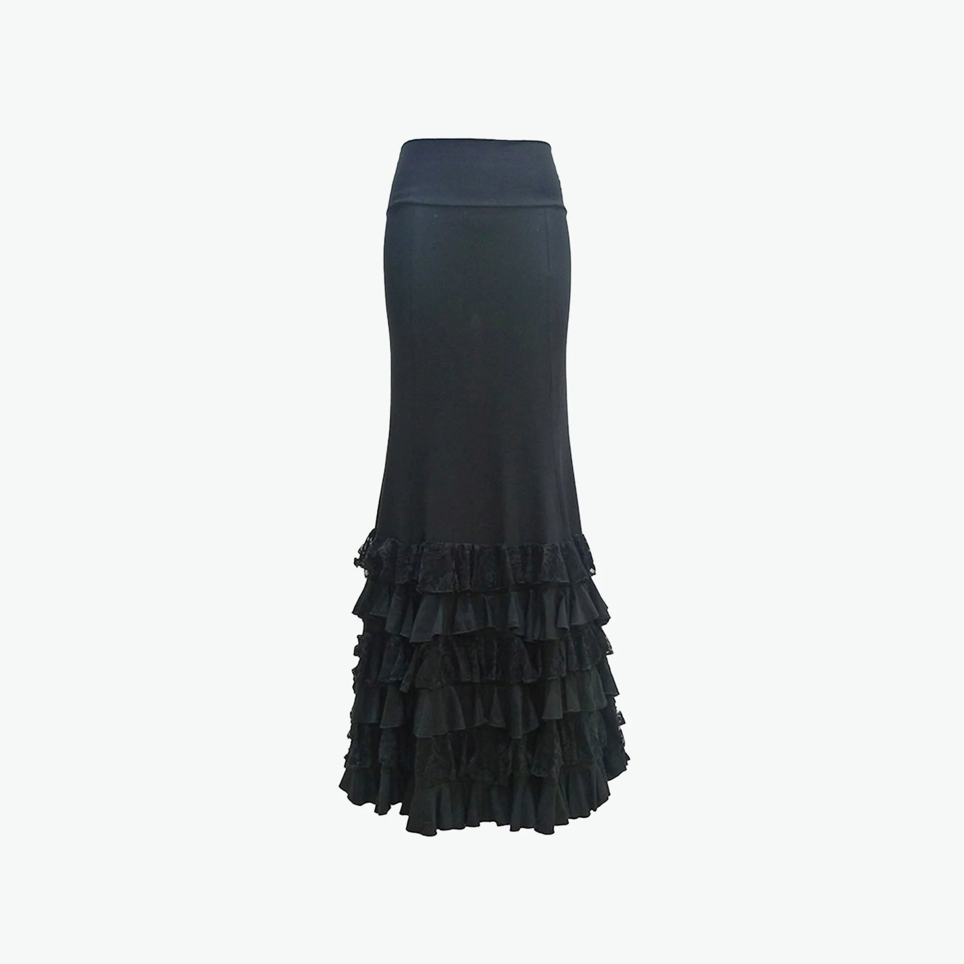 Skirt with six ruffles interspersed in viscose and lace. Lined. Model adjusted to the hips and flared. Made of viscose knit, a very pleasant organic material. The skirt can be worn both in rehearsals and classes, as well as on stage. It is comfortable and light, and enhances your figure while giving you freedom of movement.