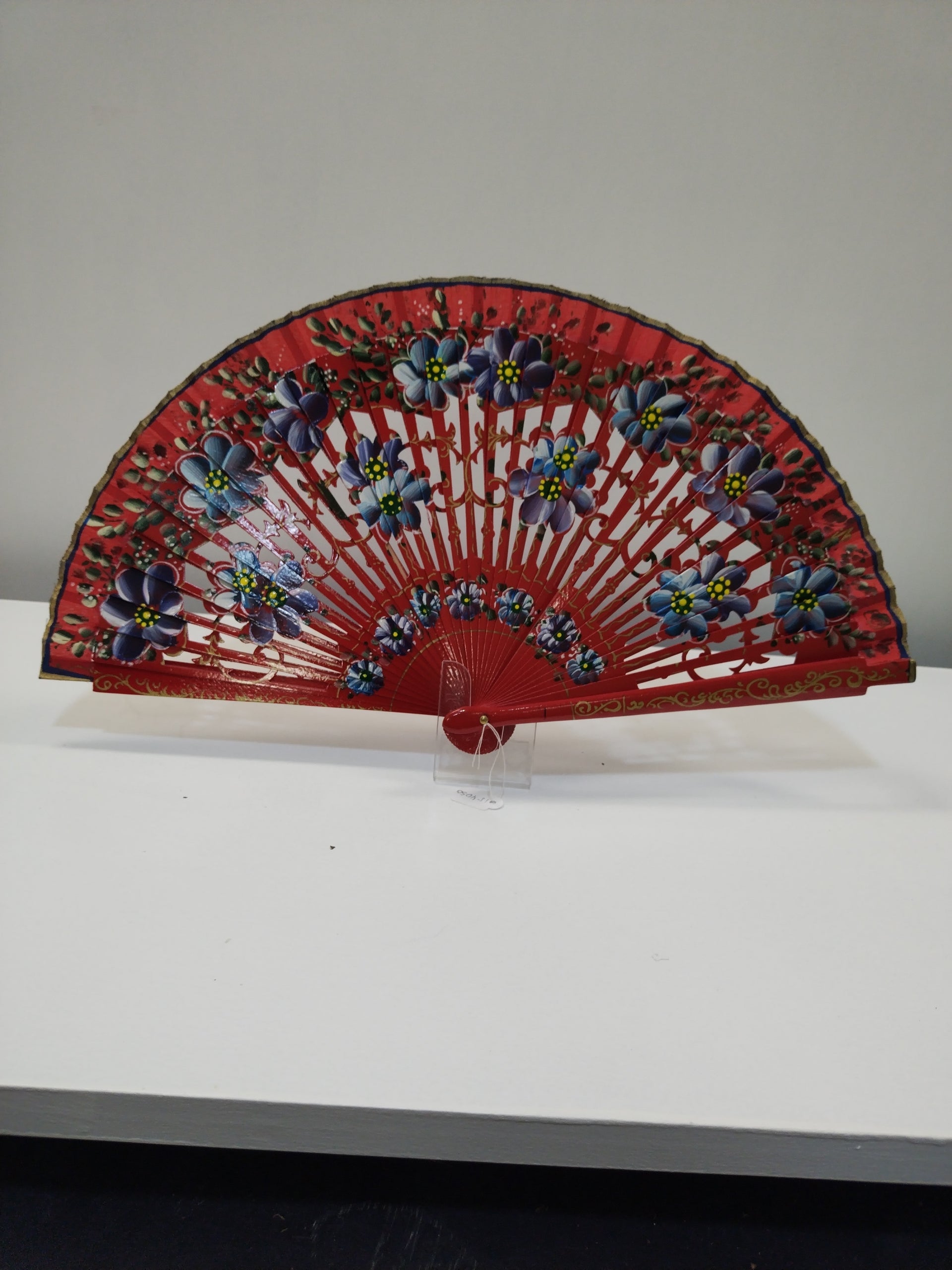 Abanico de madera tallado y lacado en rojo. Pura artesanía española pintado a dos caras con motivos florales azules. Ribete punteado con hojas.