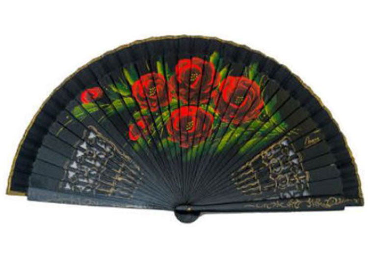 Abanico negro clásico español en madera con varillaje calado y país (tela). Pintado a mano por ambas caras con detalles florares en las que predomina el rojo y el verde.