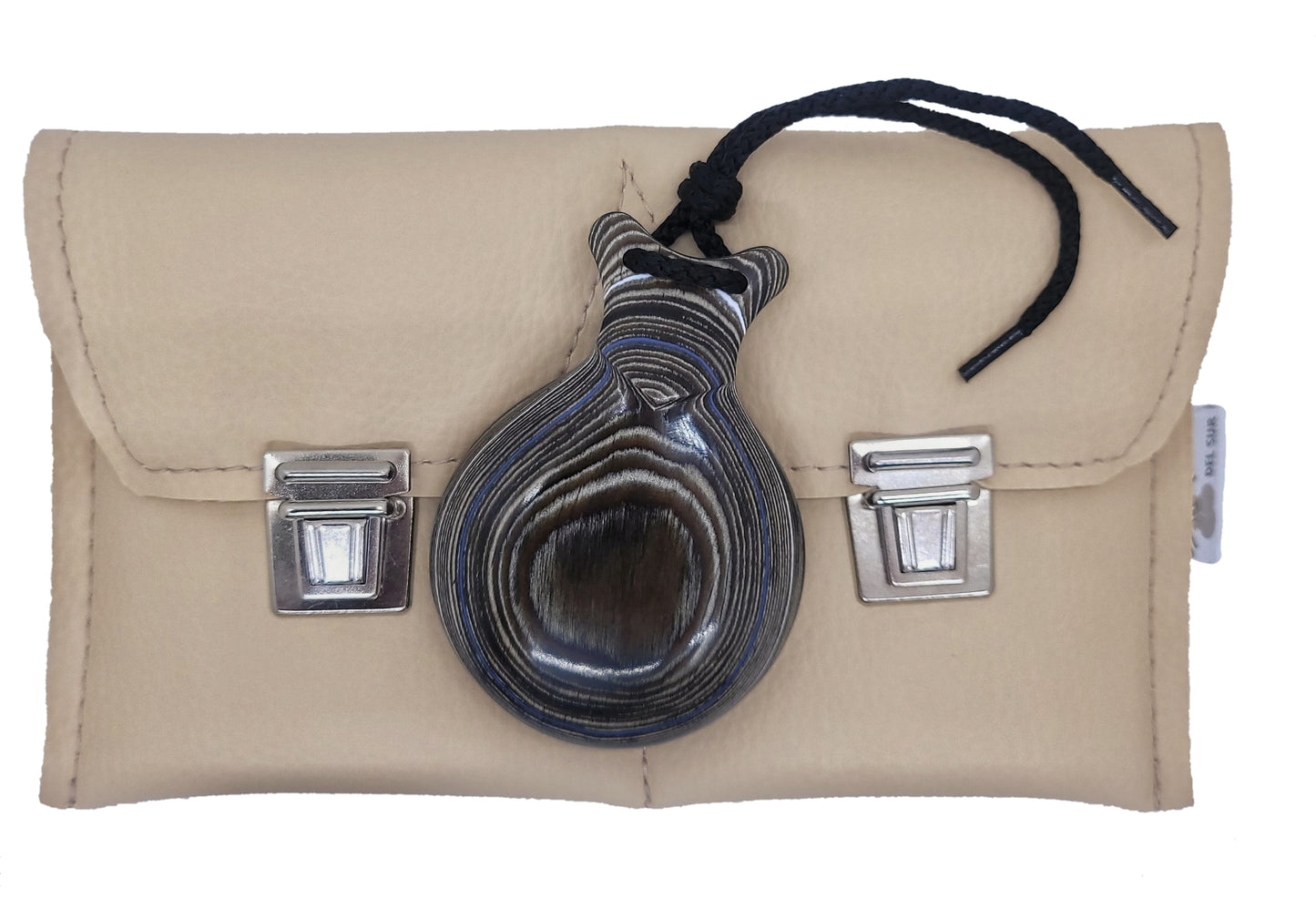Puedes elegir entre diferentes tonos: madera veteada gris, madera veteada marrón y madera veteada roja.  También si lo prefieres puedes eliminar el pico de la parte superior de la caja de resonancia, esta modificación solo afecta a la estética de la castañuela. Finalmente puedes seleccionar el color de los cordones y de la funda que las castañuelas profesionales traen consigo. La funda también se realiza de manera artesanal con polipiel en el exterior, borreguito en el interior y cierres metálicos.