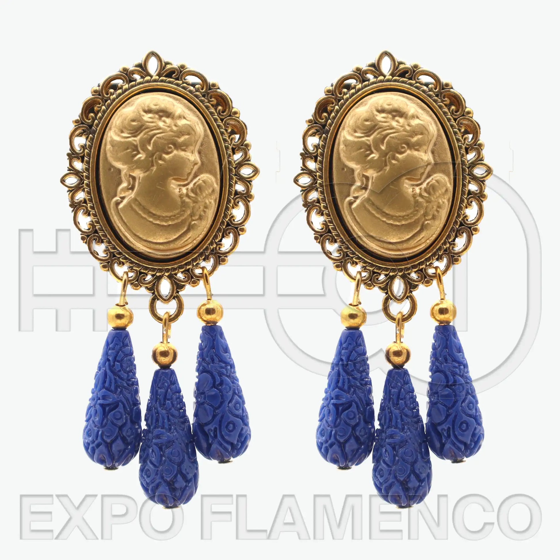 Maravillosos pendientes con gotas azules en tres versiones. En dos de ellos, el camafeo se ha sustituido por filigranas formando rosas, aun conservando el tradicional óvalo del que pende la piedra en forma de gota, tallada delicadamente. En color oro y color plata.