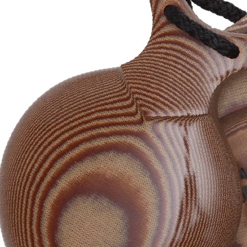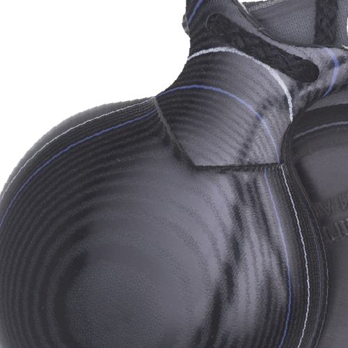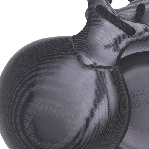 Este modelo se puede elegir en distintos colores: negro, negro con veta azul y blanca y color caramelo. Su fabricación artesanal y composición dota a la castañuela de un sonido grave muy matizado, además de ser un modelo ideal para estudios de grabación y espacios reducidos, ya que emite ondas cortas de vibración. Este modelo incluye nuestra funda especial disponible en 10 colores, con una composición de polipiel con interior de borreguito y terminaciones metálicas.