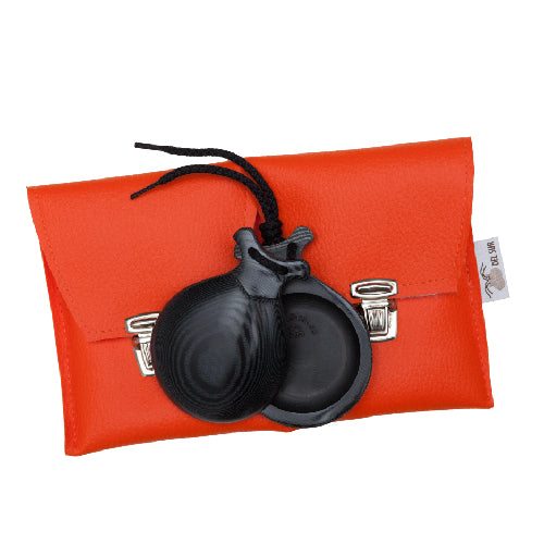 El pico de la parte superior de la caja de resonancia puede retirarse si así se desea, sin afectar al sonido. Estas castañuelas profesionales se entregan con una funda especial a escoger entre 10 colores diferentes. Realizada de manera artesanal con el exterior de polipiel, interior de borreguito y cierres metálicos.