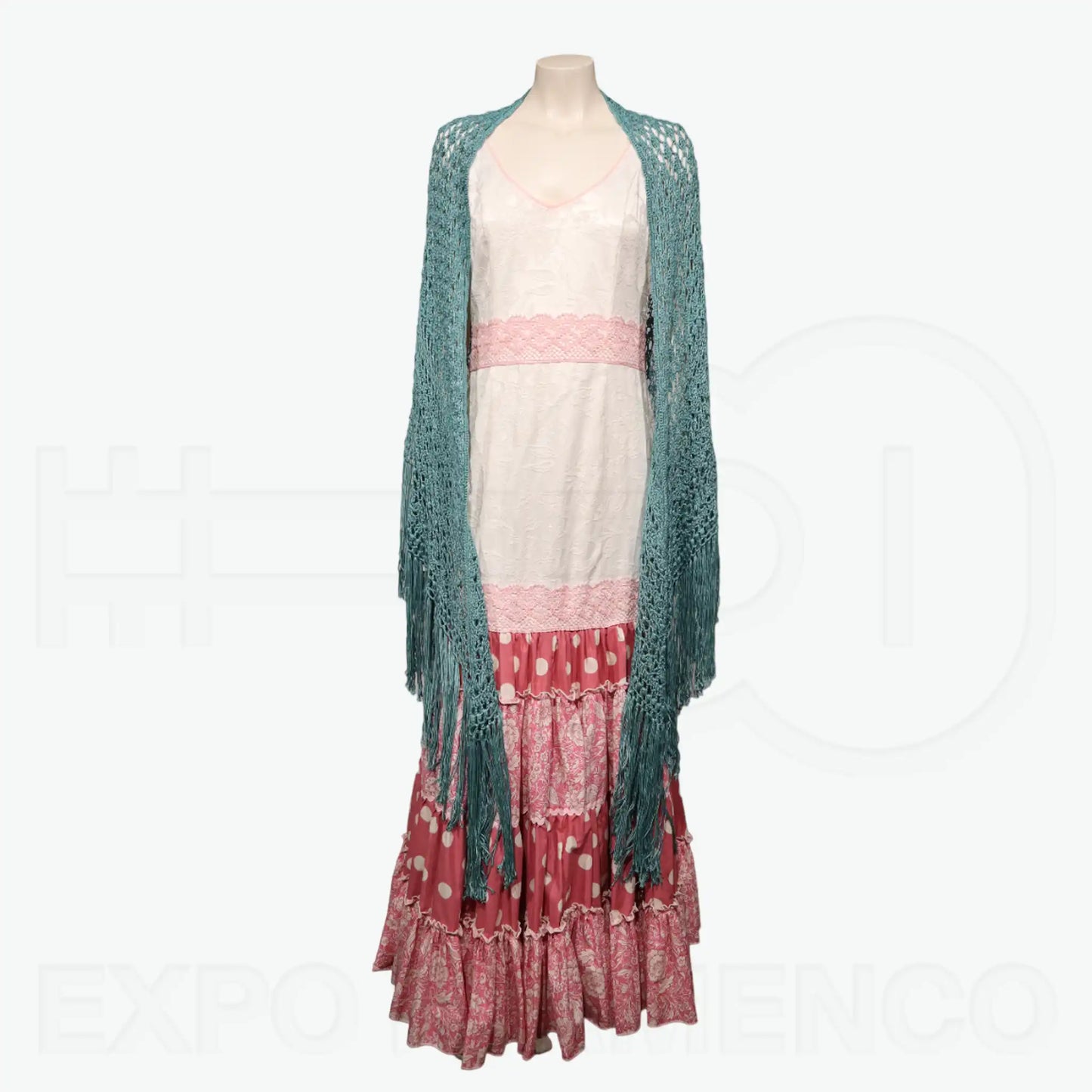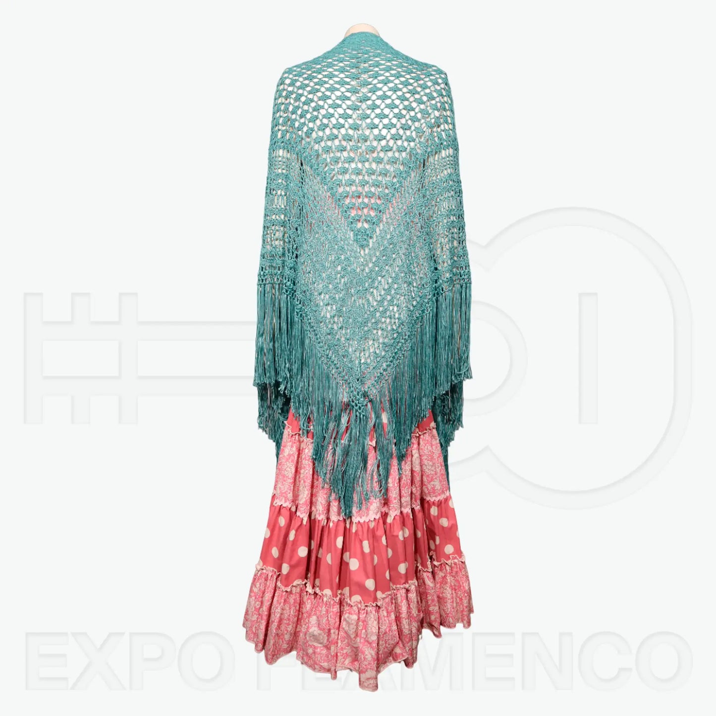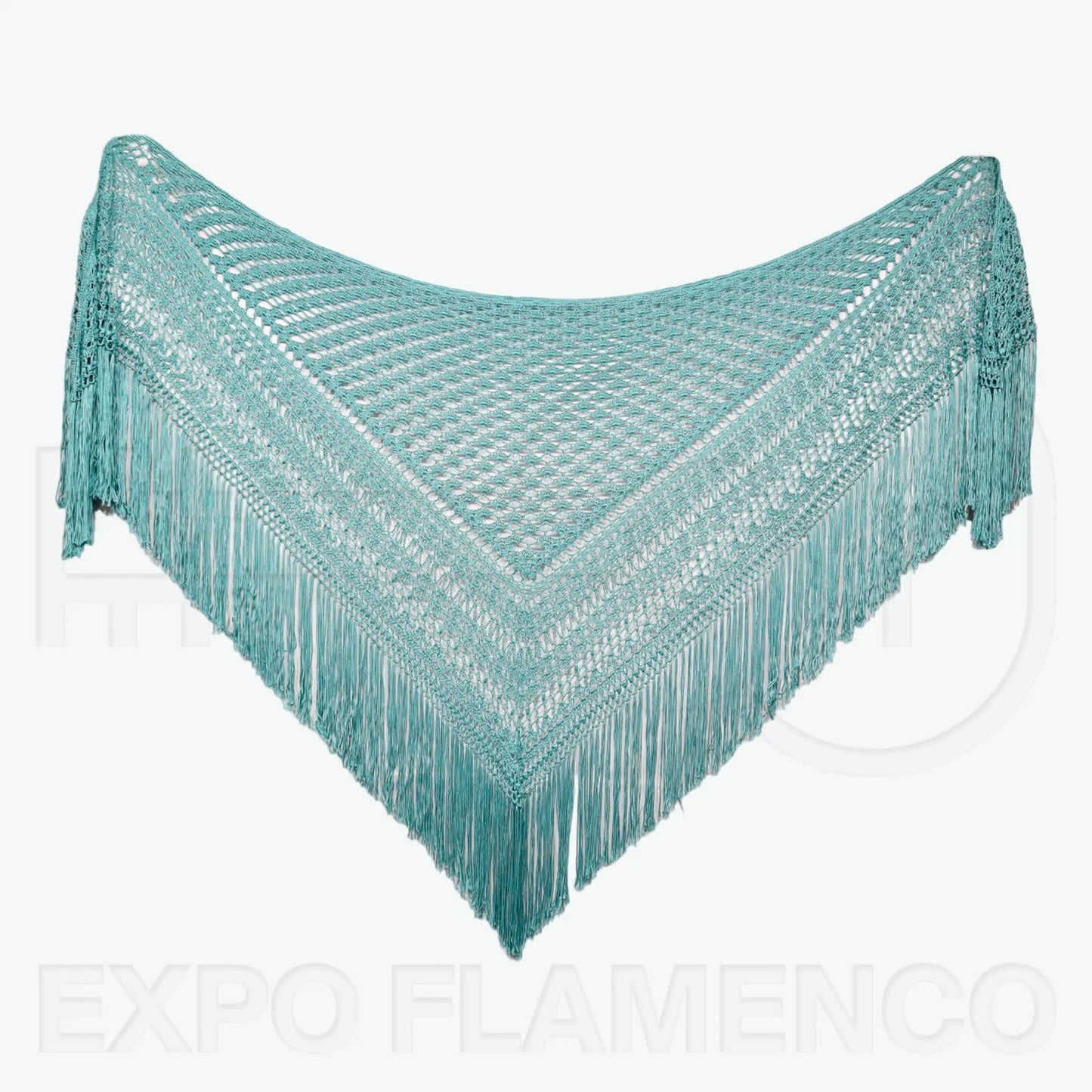Precioso chal de pico de color verde agua, con calados en forma de abanicos y un enrejado espectacular que finaliza en flecos.
