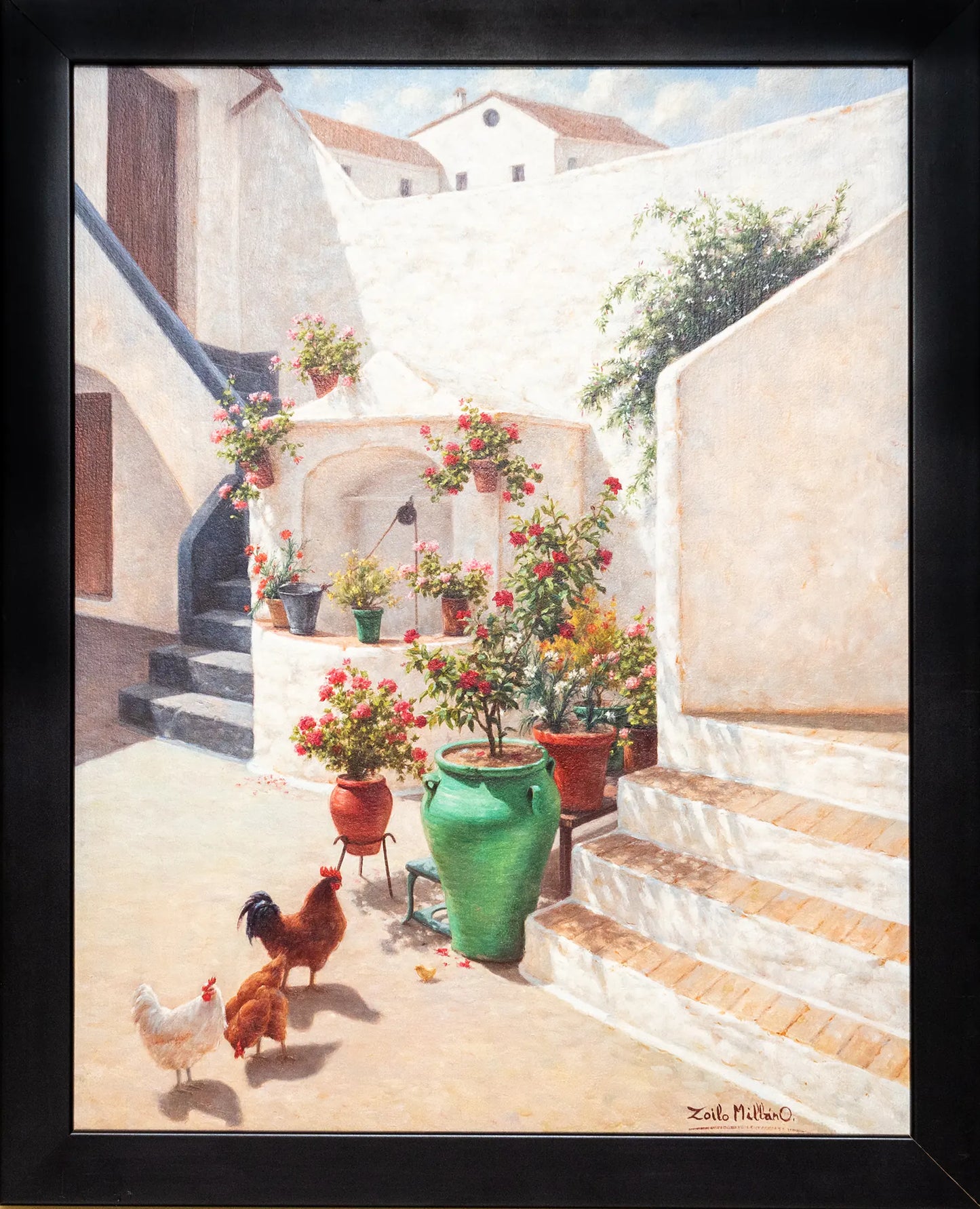 Zoilo Millán es realista, más afirmativo. Su temática recoge lugares y gentes. Es como una crónica ambiental en un marco cierto en el que la arquitectura tiene mucho que decir porque es ámbito humano. Paisajes rurales pueblos de la baja Andalucía; ventanas abiertas, con macetas en flor; escaleras y más macetas. Porque es pintura primaveral en cuanto toda ella es brote de esperanza. Son trazos simples que se llenan de notas, es una obra madura, realizada con inteligencia.