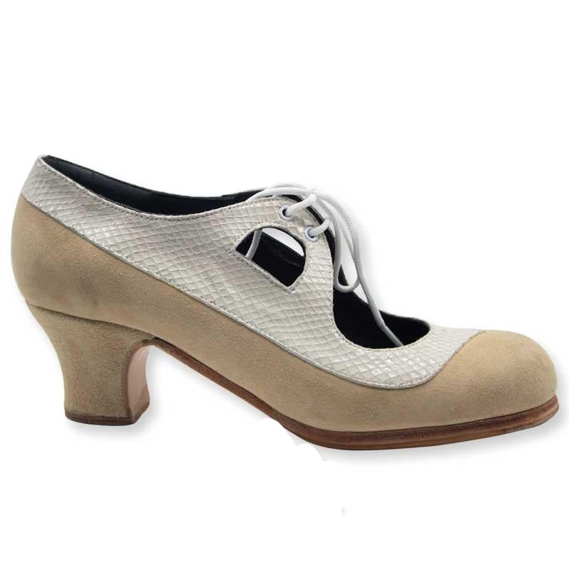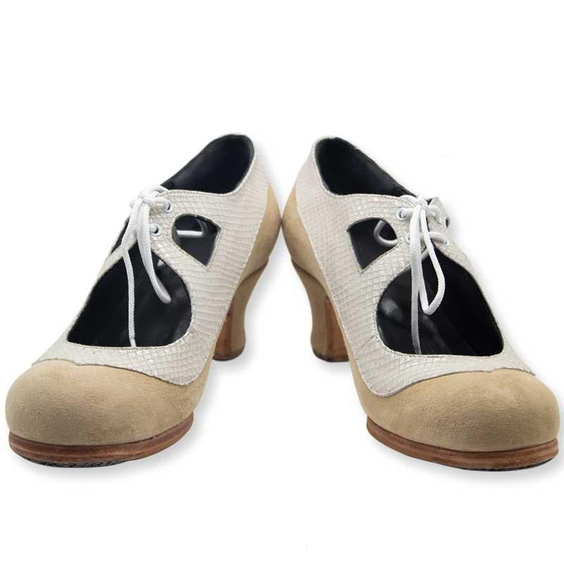Zapatos de baile profesional. Modelo Luna I hecho en ante beige y serpiente blanco.