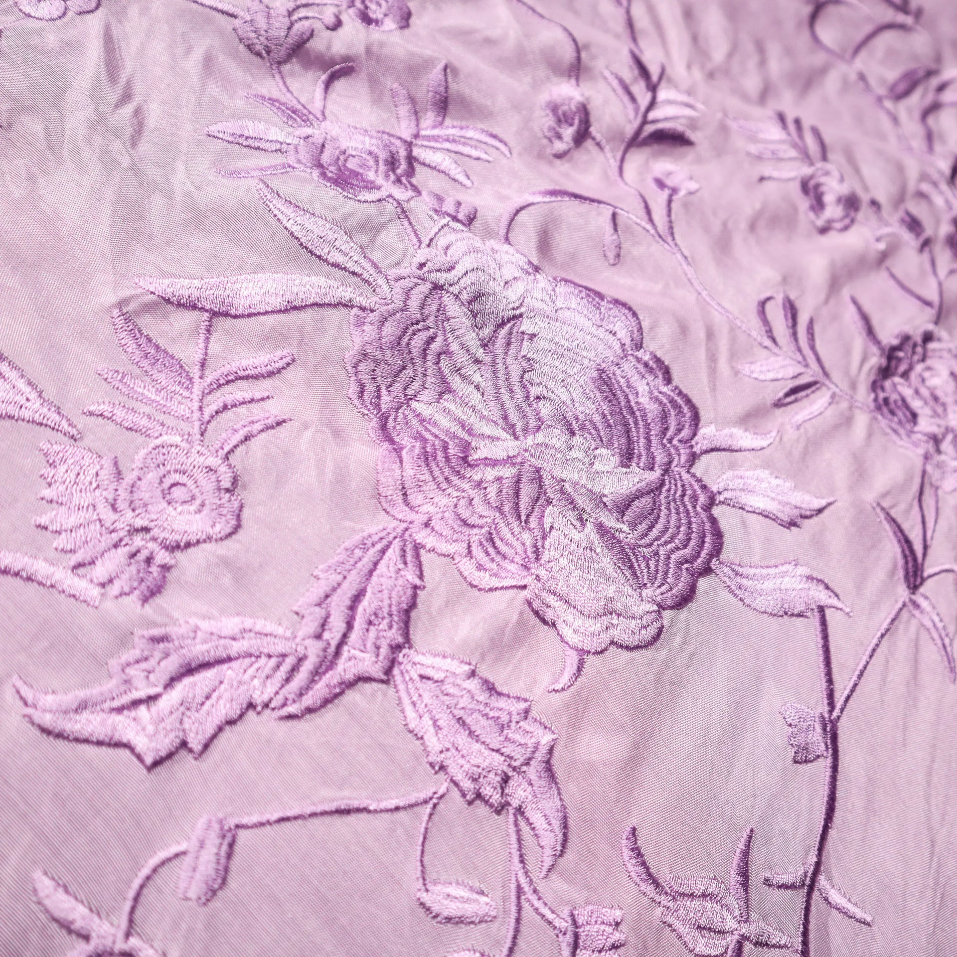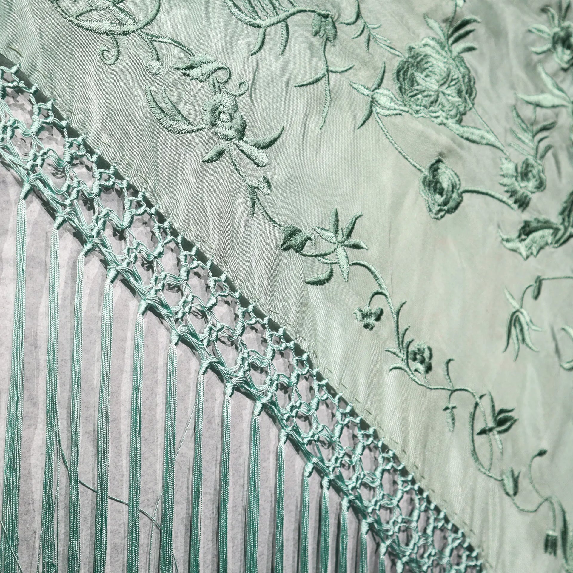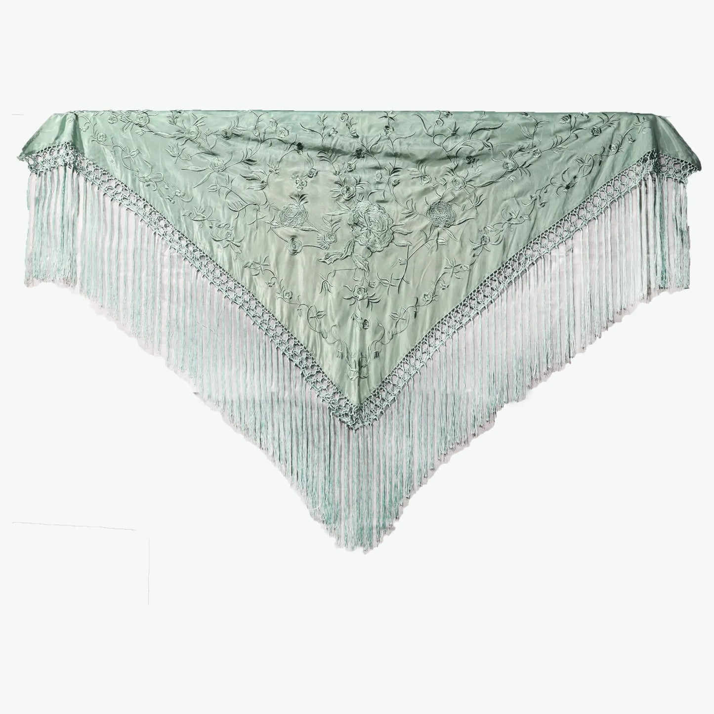 Elegante mantoncillo de crespón en una variedad de colores, exquisitamente bordado en seda. Su preciado diseño enrejado es hecho a mano usando la tradición artesana española. Medidas aprox.: Largo 130 cm, Ancho máx. 64 cm, Enrejado & Fleco 26 cm. 122 cm x 65 cm.