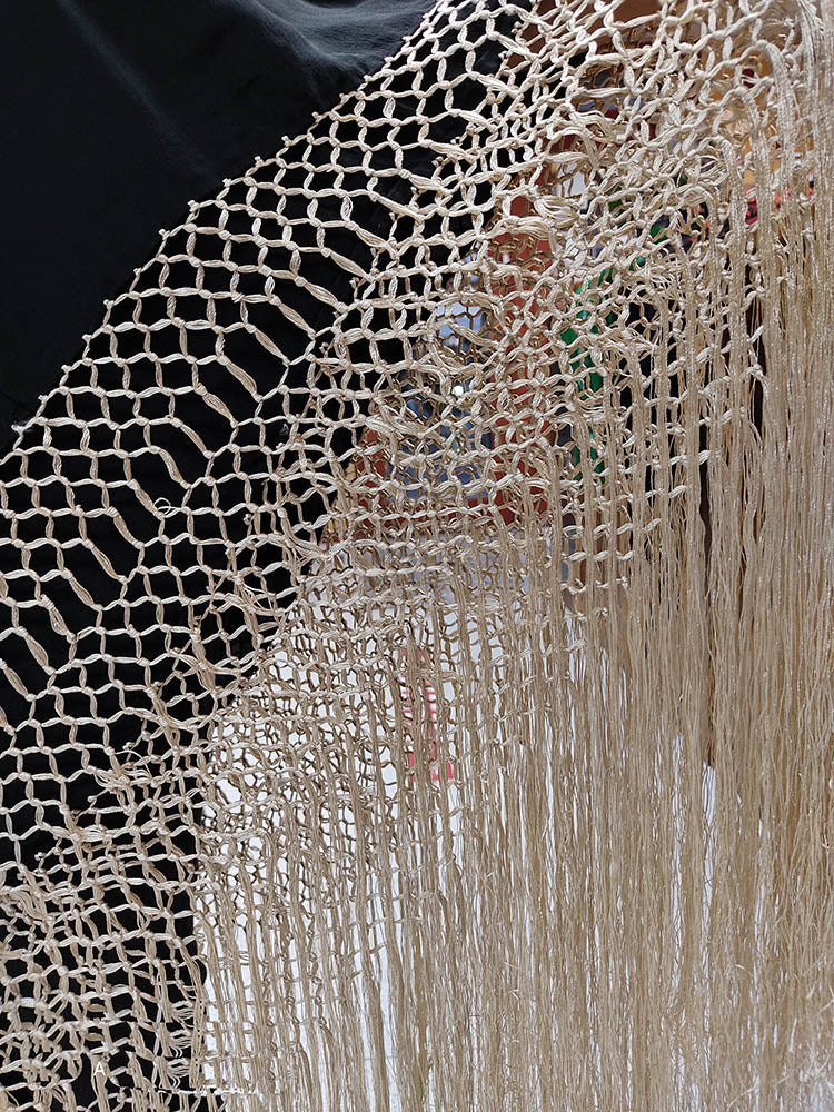 Mantón de seda rectangular, bordado a mano, con un enrejado doble elegantemente decorado con flecos de seda. Medidas: 125 x 62 cm - Enrejado: 18 cm - Flecos: 46 cm. Perfecto para eventos, ferias y bailes.