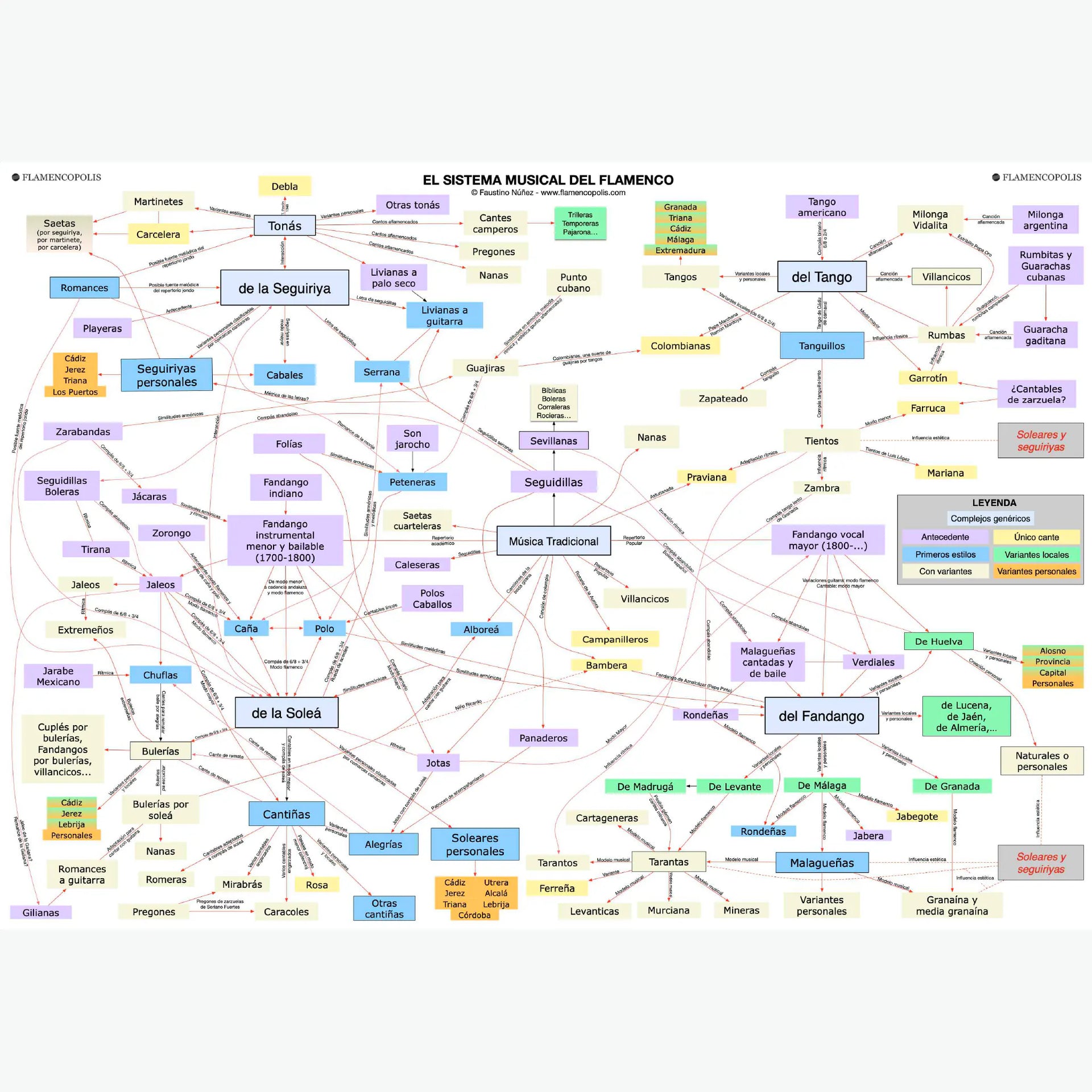 El Sistema Musical del Flamenco muestra de una forma gráfica las relaciones históricas, geográficas y musicales de los estilos que lo conforman. En el mural realizado por el musicólogo Faustino Núñez podemos apreciar esas conexiones entre los palos del flamenco, y que encontramos descritas en cada caso. La medida del mural es de un metro de ancho por setenta de ancho (100x70 cm)