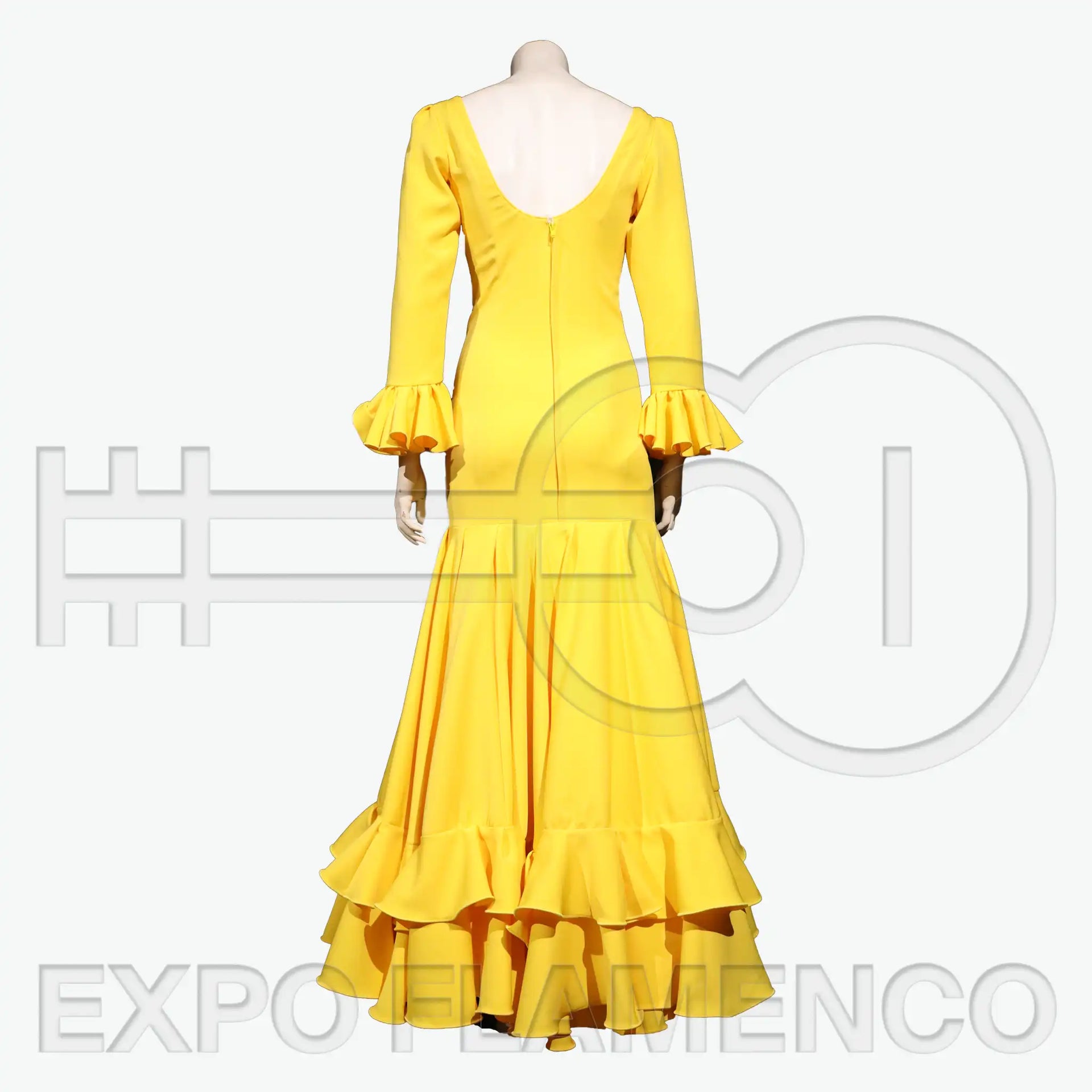 Traje de flamenca de color amarillo liso, tipo canastero. Tela de textura agradable, con elevada caída. Mangas a mitad del antebrazo, finalizadas en un volante. Cuerpo de escote en V redondeado y corte bajo en caderas del que sale un gran vuelo finalizado en dos volantes pequeños a los que le dan cuerpo un cancán del mismo tejido y vuelo. Espalda amplia.