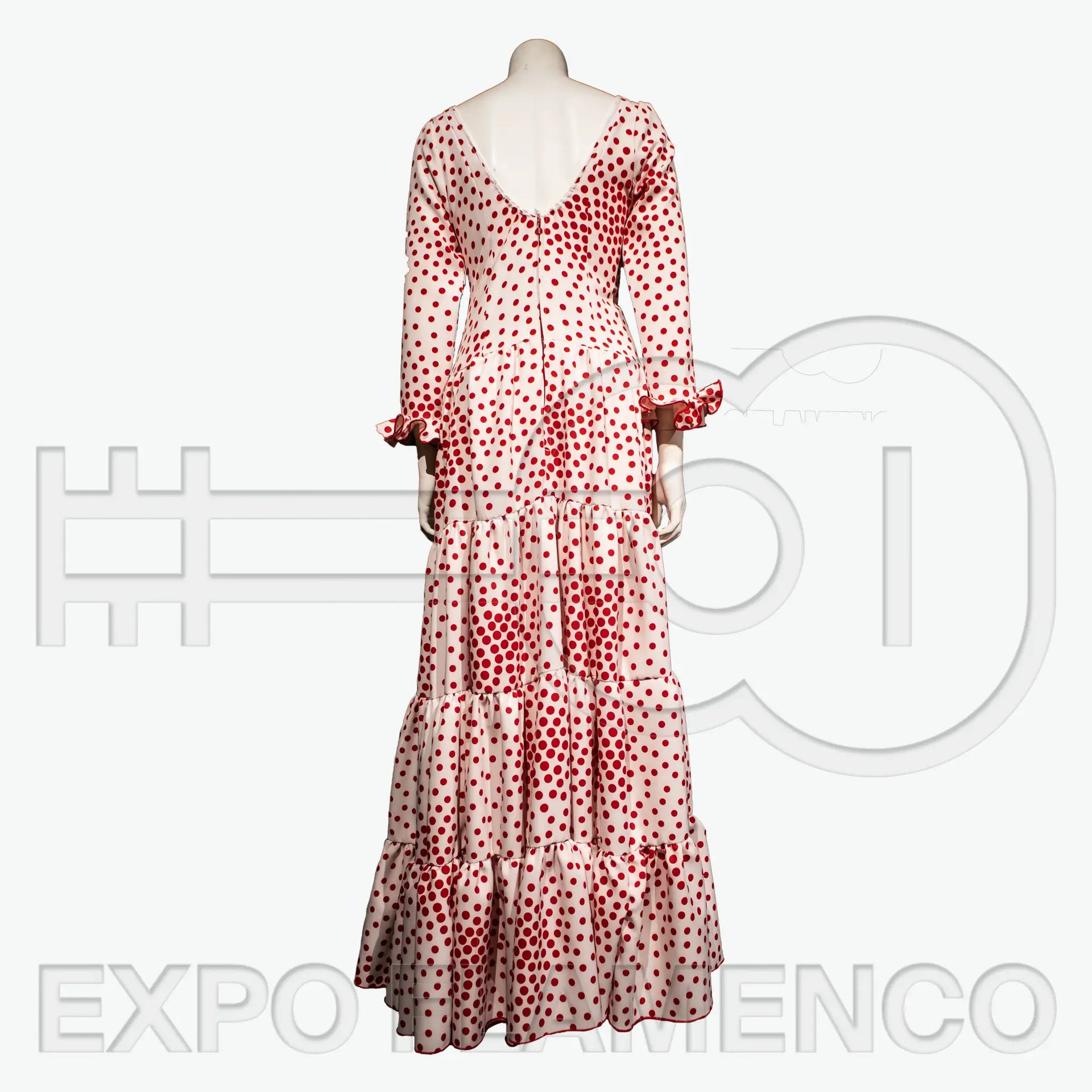 Esta es una confección incomparable, dada sus características. La caída del tejido no muestra el gran vuelo capaz de desplegar con sus cuatro añadido que agigantan el único volante. La comodidad de la elastina, su ligereza y la frescura del tejido, lo hace apropiado para romerías y baile. El propio diseño de la tela ya de por sí es original, con lunares que se agrupan creando manchas rojas, en contraste con los que se alejan y favorecen el blanco de su fondo.