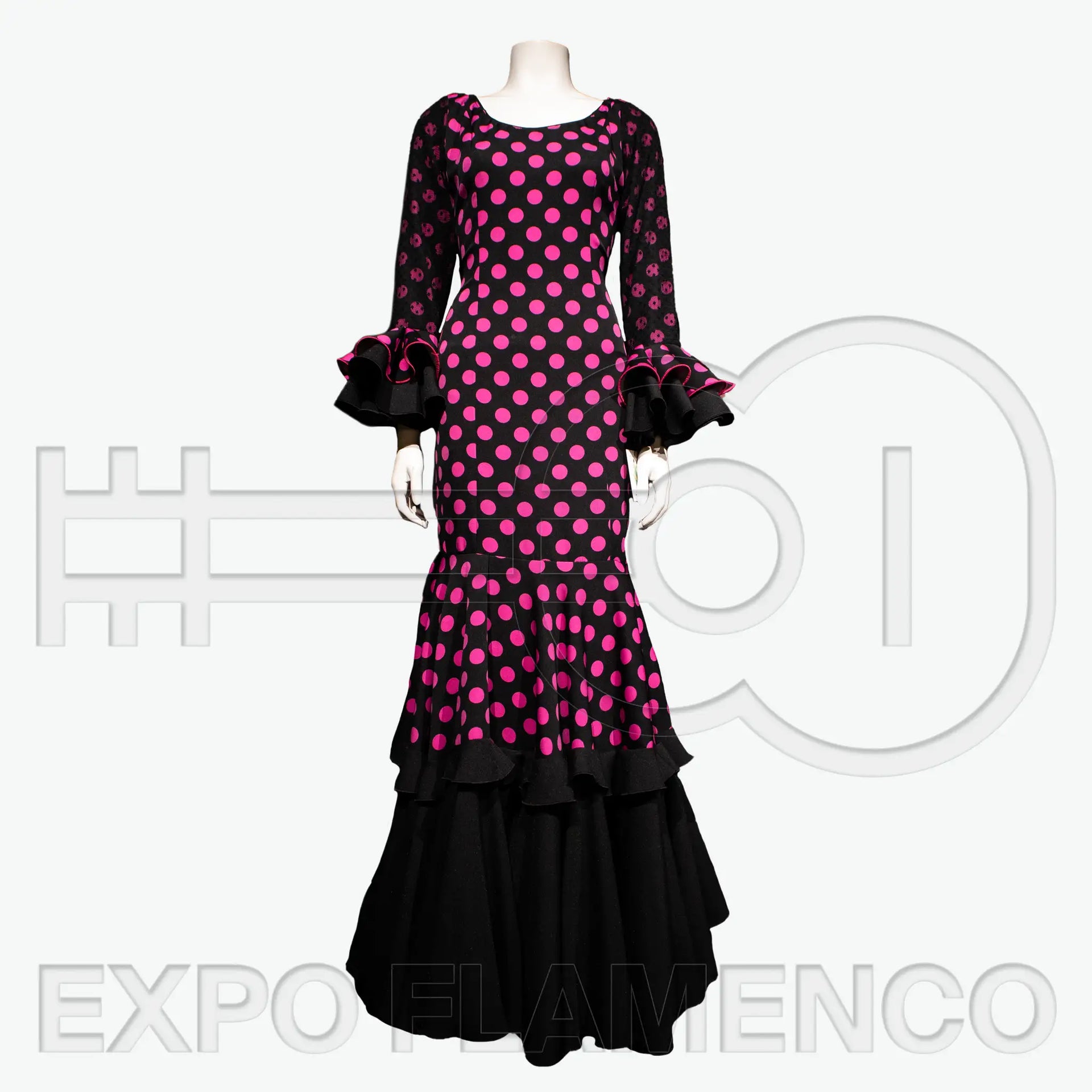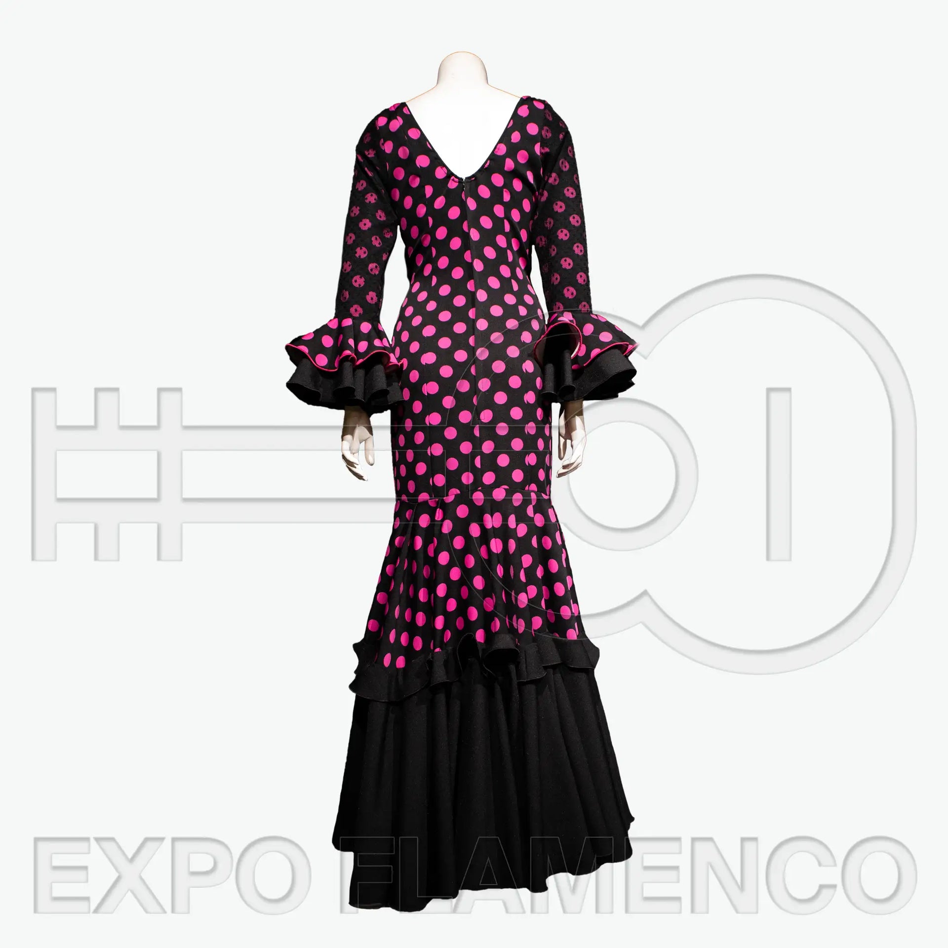 Elegantísimo traje de Flamenca de fondo negro y destacados lunares fucsias. Dos volantes de gran capa que ofrece un magnífico vuelo. El cancán, con bolsillo incluido, es de color fuxia o verde, subrayando así el contrastes en los colores del traje. Las mangas están cubiertas de encaje negro.